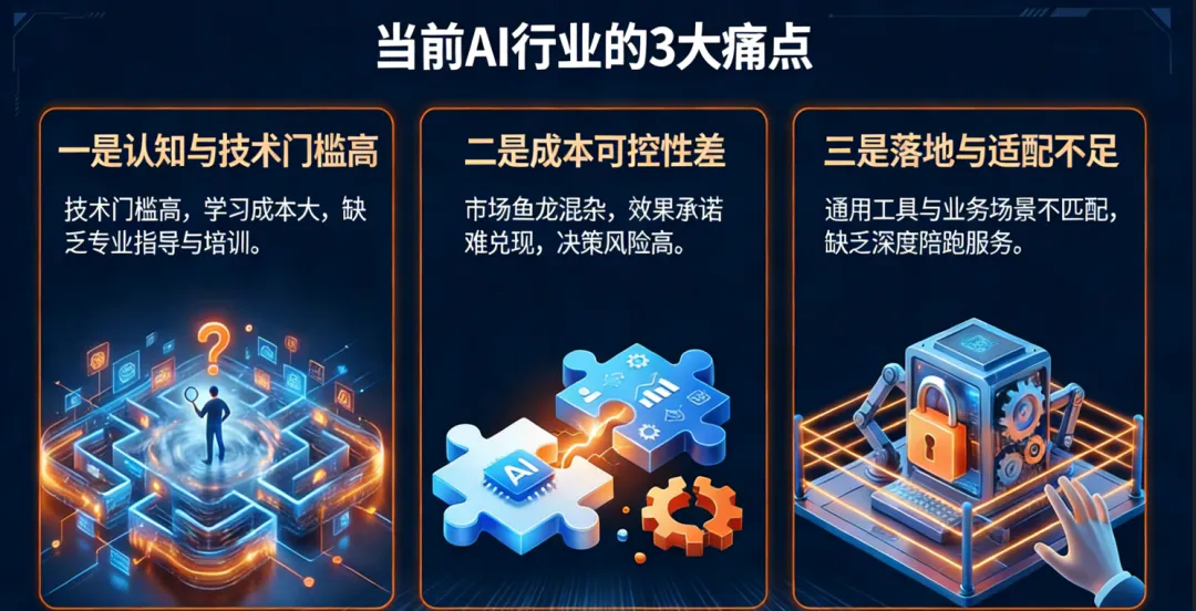 很多人觉得AI离自己很远,但其实,中小企业的AI转型痛点,就是最直接的财富入口。当下,中小企业使用AI工具的困境,集中在3点,每一点都是可落地的盈利机会: