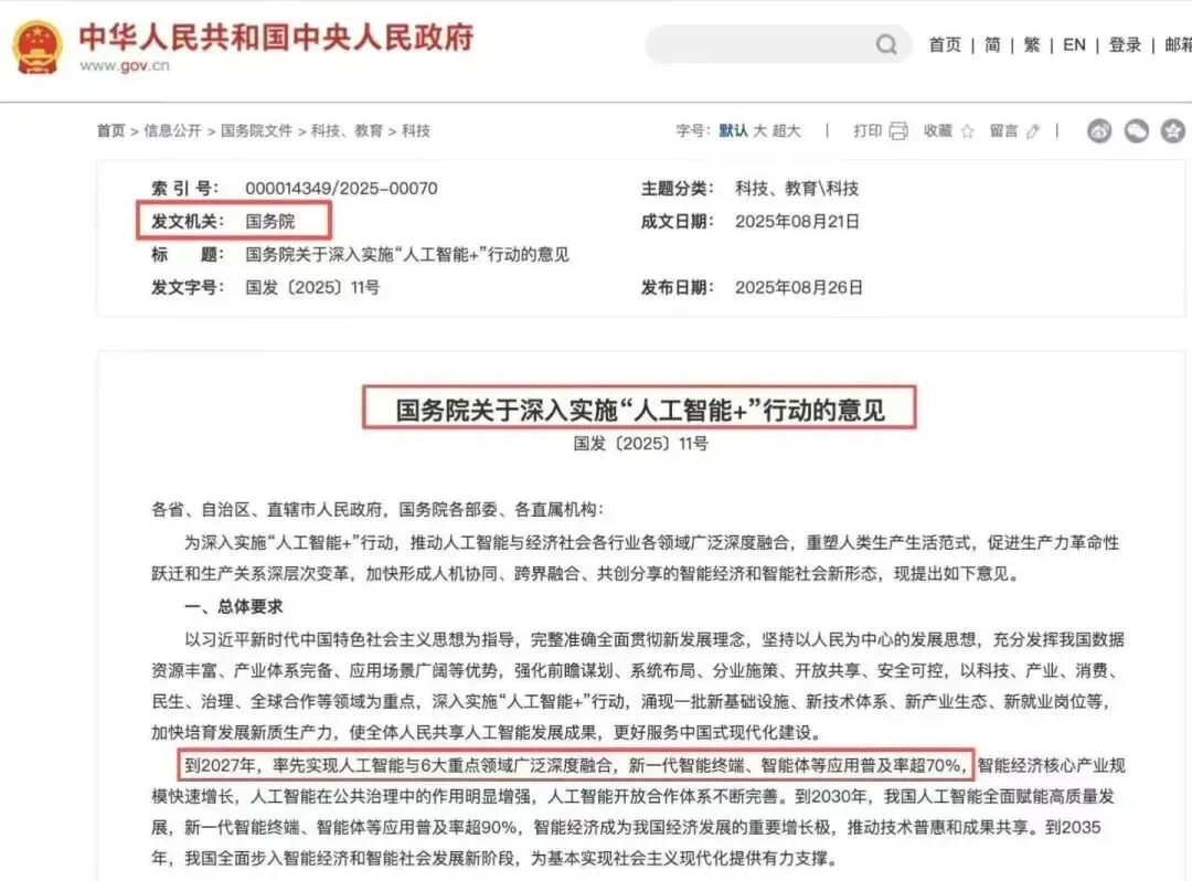 2025年8月,国务院《关于深入实施“人工智能+”行动的意见》明确提出:到2030年,新一代智能终端、智能体等应用普及率将超90%!