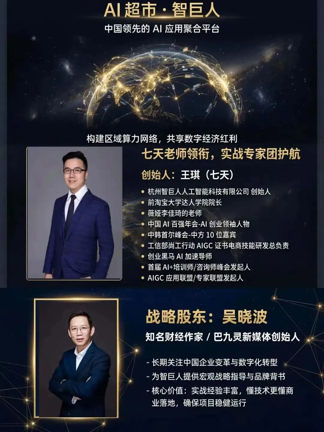 核心技术团队由7天老师(王琪)带领,汇聚阿里、字节、百度等一线互联网巨头精英,兼具深厚技术底蕴与生态运营基因,自主研发AI中台,实现全链路产业赋能。
