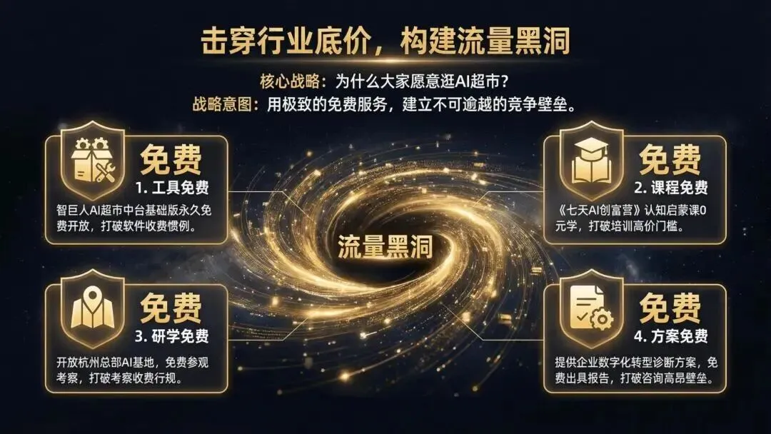 【智巨人】以“平台+本地化服务”双引擎模式,颠覆传统AI服务格局,将复杂的AI技术封装为可落地的一站式解决方案,打破技术壁垒,让AI走进千行百业。更有四大免费福利,大幅降低准入门槛,诚意满满: