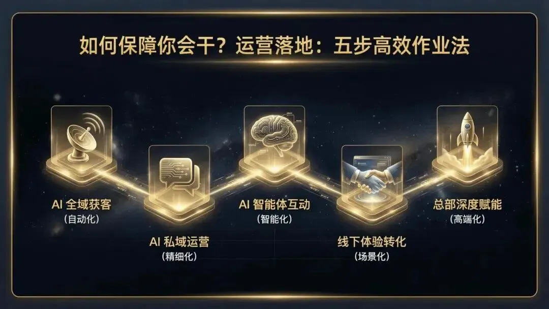 为此,平台打造一套五步高效作业法,为合伙人提供从获客到转化的全链路赋能,全程保驾护航,哪怕是零基础创业者,也能快速上手: