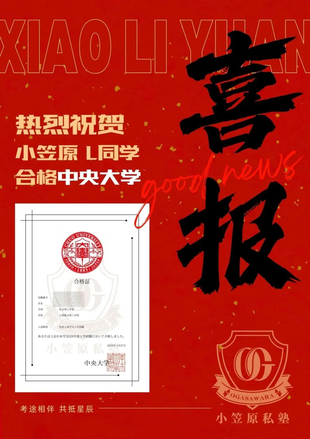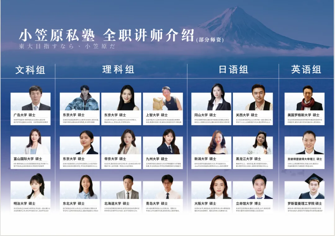 小笠原师资均毕业于日本 TOP 名校,拥有6 年以上一线教学经验,亲手助力大批学员成功进入东大、阪大、一桥、早稻田、庆应义塾等顶尖院校。