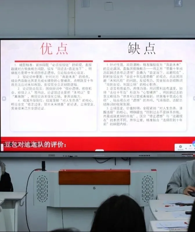 3月30日晚19:00,决赛战鼓敲响。现场气氛紧张而热烈,选手们精神饱满、言辞铿锵。决赛辩题为“如果有一个按钮你必须按下,你会选择回到十年前还是去往十年后”。双方辩手就该主题展开的精彩交锋,引发了评委与观众的深层思考。赛场上金句频出,双方辩论难分高下,最终“黄油小熊队”以0.6分的微弱优势战胜“迪迦队”,夺得本届辩论赛冠军。