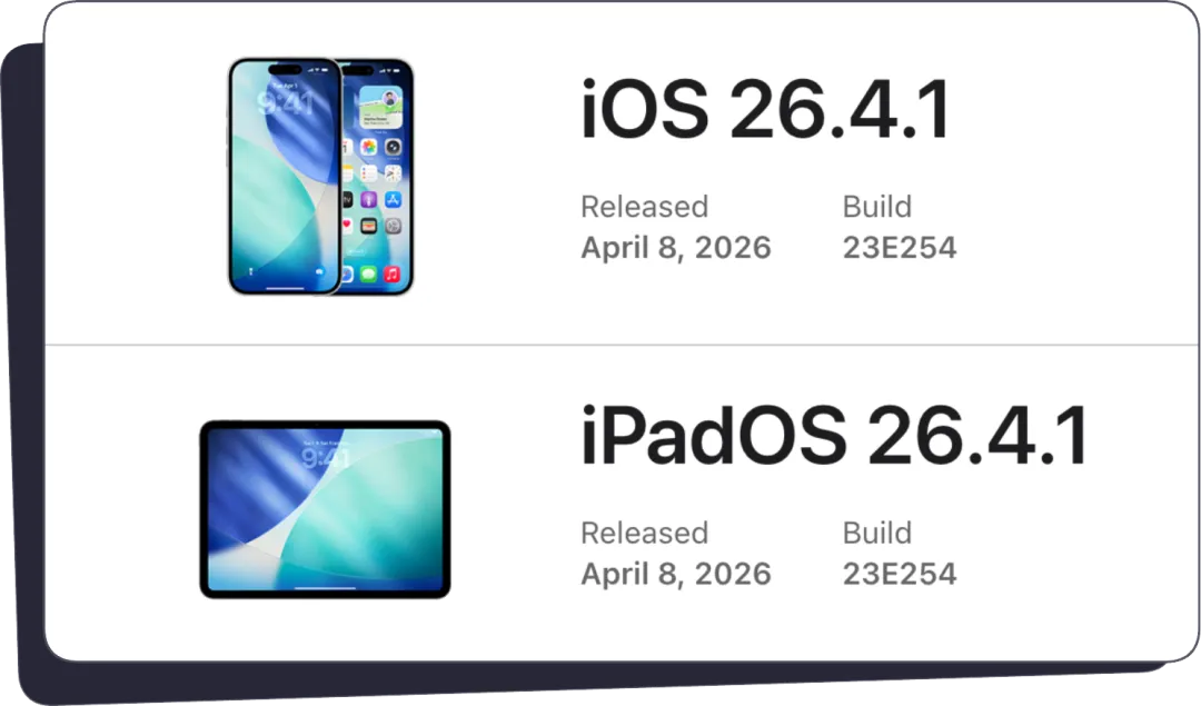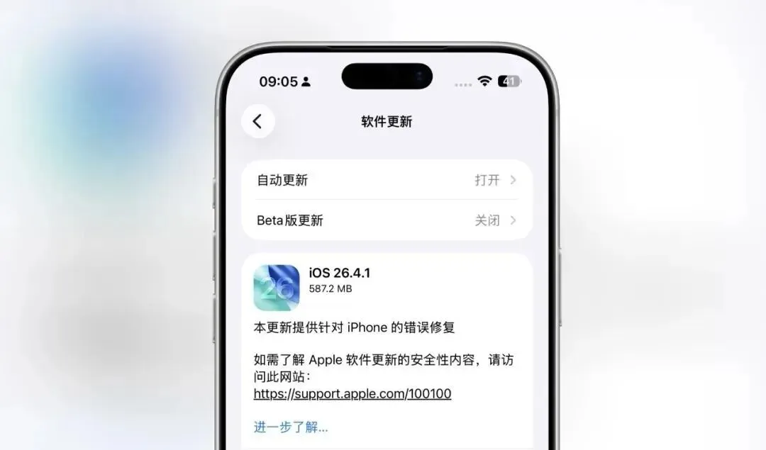 昨天天凌晨苹果向iPhone 发送了 iOS 26.4.1 正式版系统更新,iPad 也跟着上了 iPadOS 26.4.1,内部版本号 23E254,OTA 包在 500MB 到 600MB 之间,苹果给的更新说明很短,就一句重要的错误修复,界面层面基本看不到新东西,主打把底层稳定性垫起来。