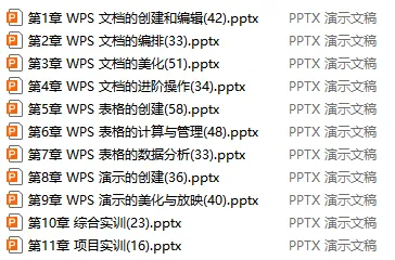 《WPS Office 办公软件应用(微课版)》教学课件+教案+教学大纲 点击上方蓝色字关注我《WPS Office 办公软件应用(微课版)》教学课件+教案+教学大纲资料目录下载拉至二维码处资料展示按识别此二维码下载电子版资料链接:http://jazpan.com/box/31462图文来自网络,版权归原作者,如有不妥,告知即删点击阅读原文下载