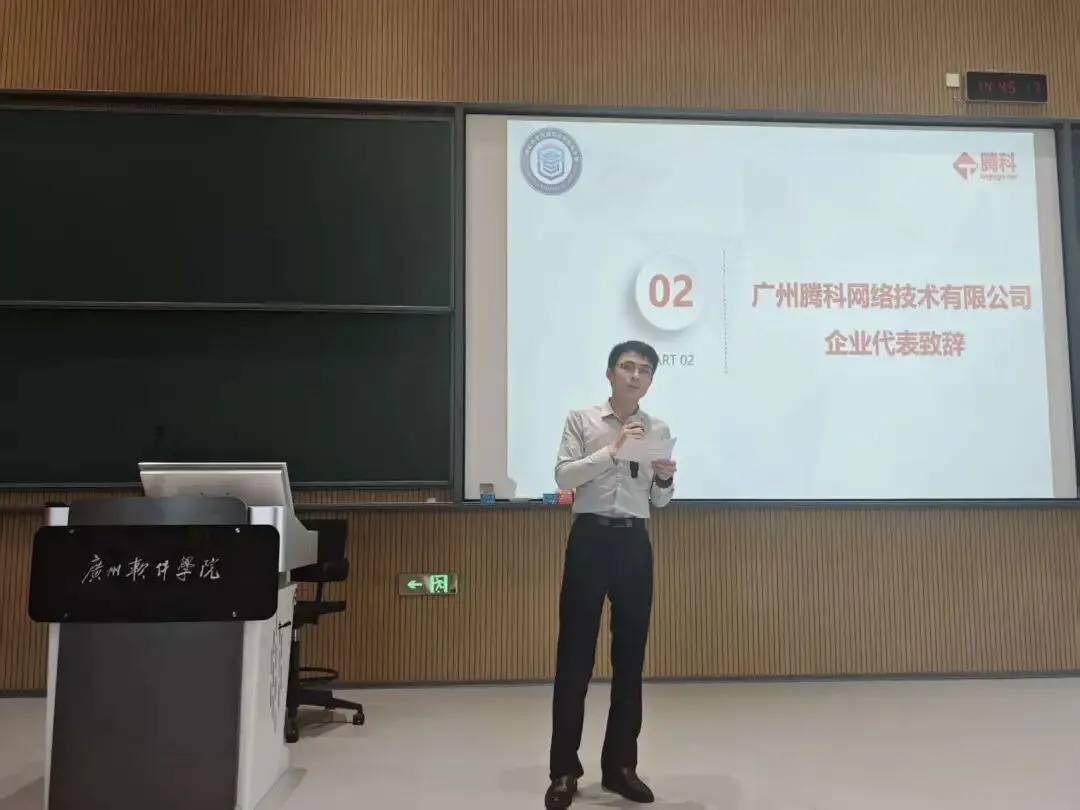 企业代表温利营经理在致辞中,回顾了本次校企合作的缘起与核心目标,并对全体学员提出三点期望。其一,保持空杯心态,无论原有基础如何,都从零开始扎实学习;其二,秉持实践精神,主动提问、勤于实操,将课堂知识转化为实际应用能力;其三,强化团队意识,在学习中互帮互助、凝聚合力,共同成长进步。他表示,广州腾科网络技术有限公司将以此次培养计划为桥梁,做好校园与产业的衔接工作,助力学员掌握华为核心技术,为学员的职业发展保驾护航,同时预祝本次培养计划取得圆满成功。