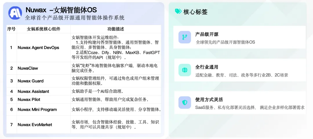 女娲智能体OS底座:开源通用智能体内核、多智能体协同、技能生态、私有化部署、权限全链路管控、系统无缝集成,让AI从“辅助工具”变为“业务执行主体”。