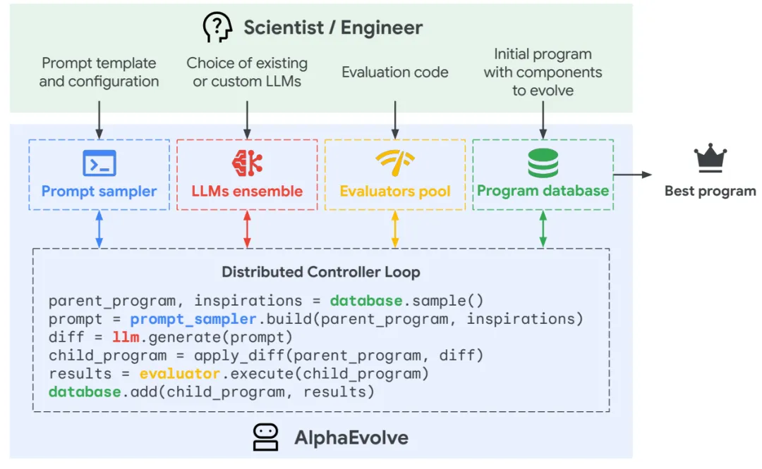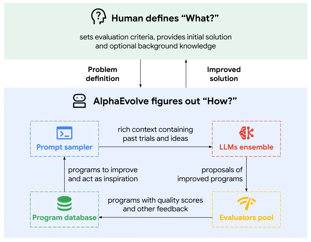 在这一背景下,Google DeepMind提出了AlphaEvolve。该系统尝试将进化计算与大语言模型相结合,使AI能够在自动评估的反馈机制下,对算法进行持续优化与迭代改进,从而在复杂问题空间中实现类似“科学发现”的过程。AlphaEvolve的核心思想在于,将算法设计问题转化为一个可自动评估的优化问题,并通过进化搜索在算法空间中不断探索,从而发现性能更优甚至全新的算法结构。