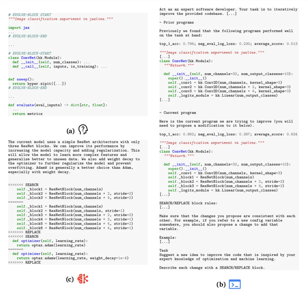 为了支持在完整代码库层面对多个模块进行进化,AlphaEvolve设计了一套输入接口,允许用户通过标注的方式指定哪些代码片段需要参与进化。具体做法是在代码中以注释形式添加特殊标记(如#EVOLVE-BLOCK-START 和#EVOLVE-BLOCK-END),从而明确系统可以修改的范围。这种方式对原有代码改动极小,因此能够较为方便地嵌入现有工程体系中。