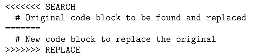 在这里,<<<<<<< SEARCH 和 ======= 之间的代码是当前程序版本中要精确匹配的片段;======= 和 >>>>>>> REPLACE 之间的代码则是将替换原始代码的新片段。这样可以针对代码的特定部分进行针对性的更新。