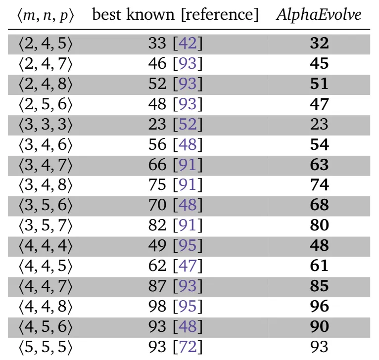 在算法设计方面,论文重点研究了矩阵乘法这一基础问题。矩阵乘法可以被表示为张量分解问题,其核心目标是降低计算所需的标量乘法次数。实验结果如图5所示,在多个不同规模的矩阵乘法任务中,AlphaEvolve均能够达到甚至超越当前最优水平。例如,在经典的4×4矩阵乘法问题中,AlphaEvolve成功将所需乘法次数从49次降低至48次,这是对Strassen算法提出56年以来的首次改进,说明该方法具备发现新算法结构的能力。