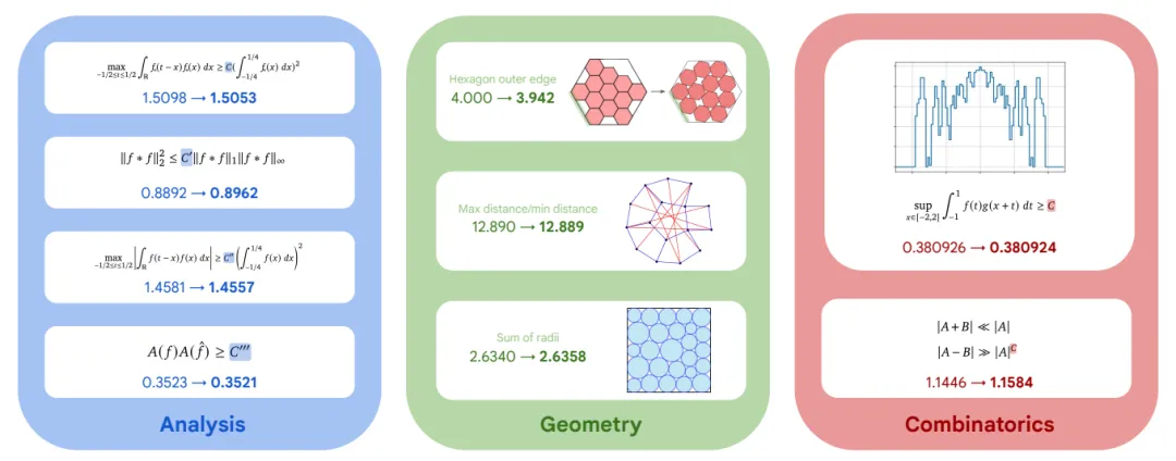 图 6 AlphaEvolve在不同数学问题上的性能提升示例