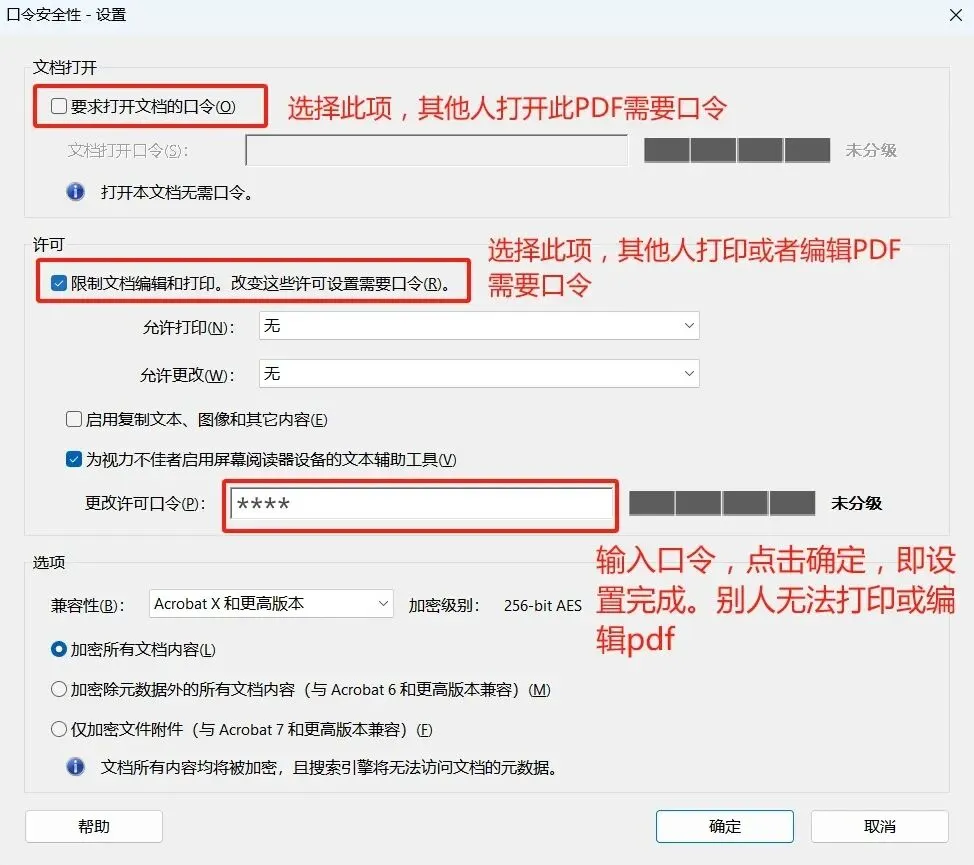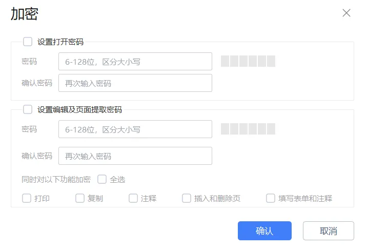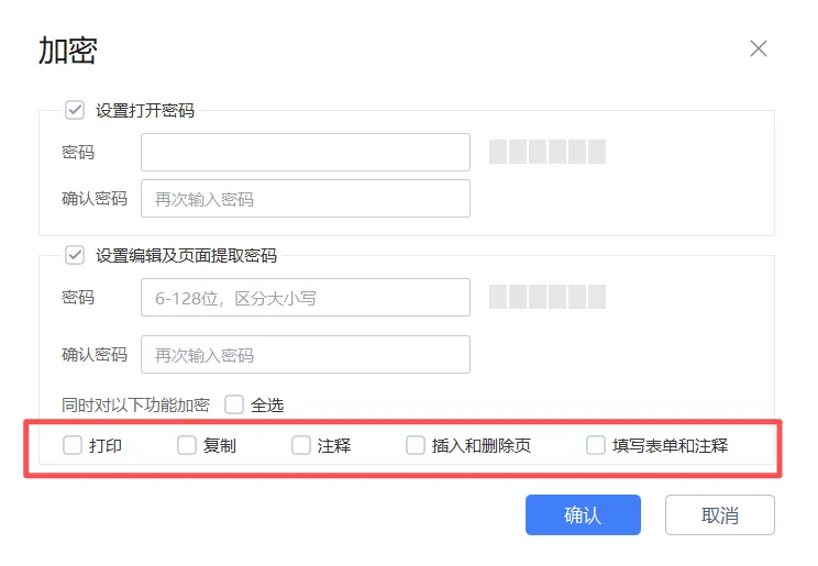 核心设置:在弹出的窗口中,你可以分别勾选“设置打开密码”和“设置编辑及页面提取密码”。