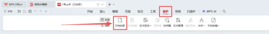 操作路径:打开 PDF 后,点击顶部菜单栏的「保护」 -> 「文档加密」。