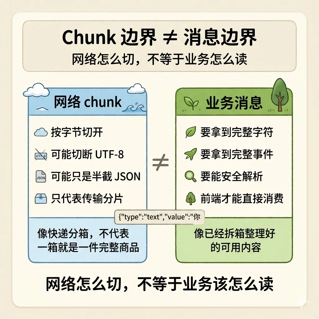 chunk 边界、半截 JSON、消息历史怎么记、流到一半要不要让用户停下。