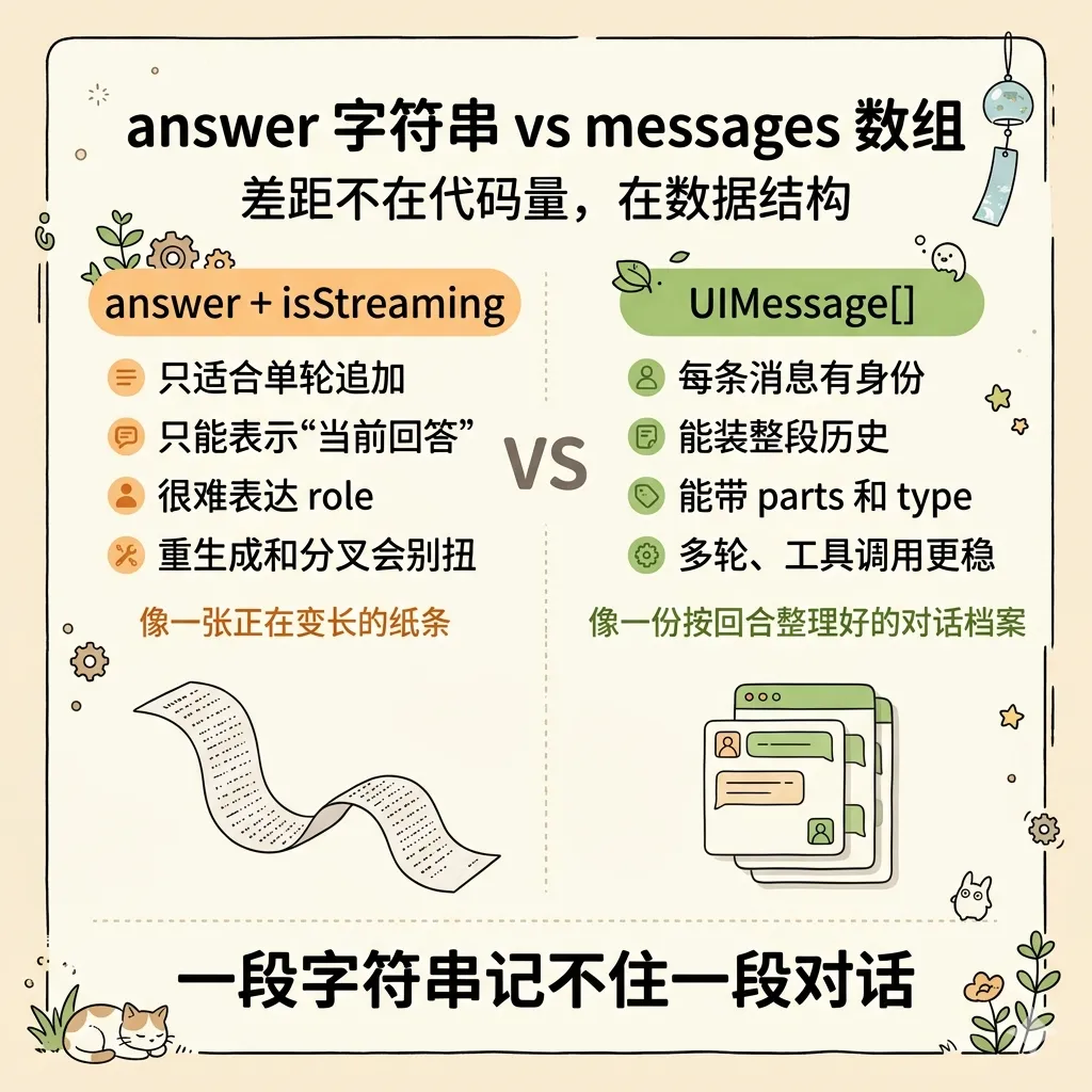 把 answer 这种单字符串状态换成 useChat 和 messages,后面多轮、重生成、分叉、工具调用才有稳定地基。