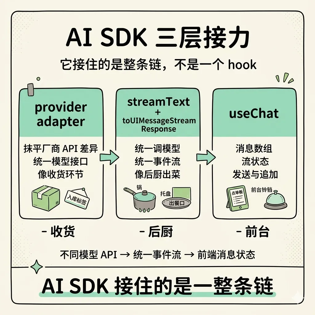 AI SDK 这套架构,几乎就是把这家餐厅的分工原封不动搬过来了。