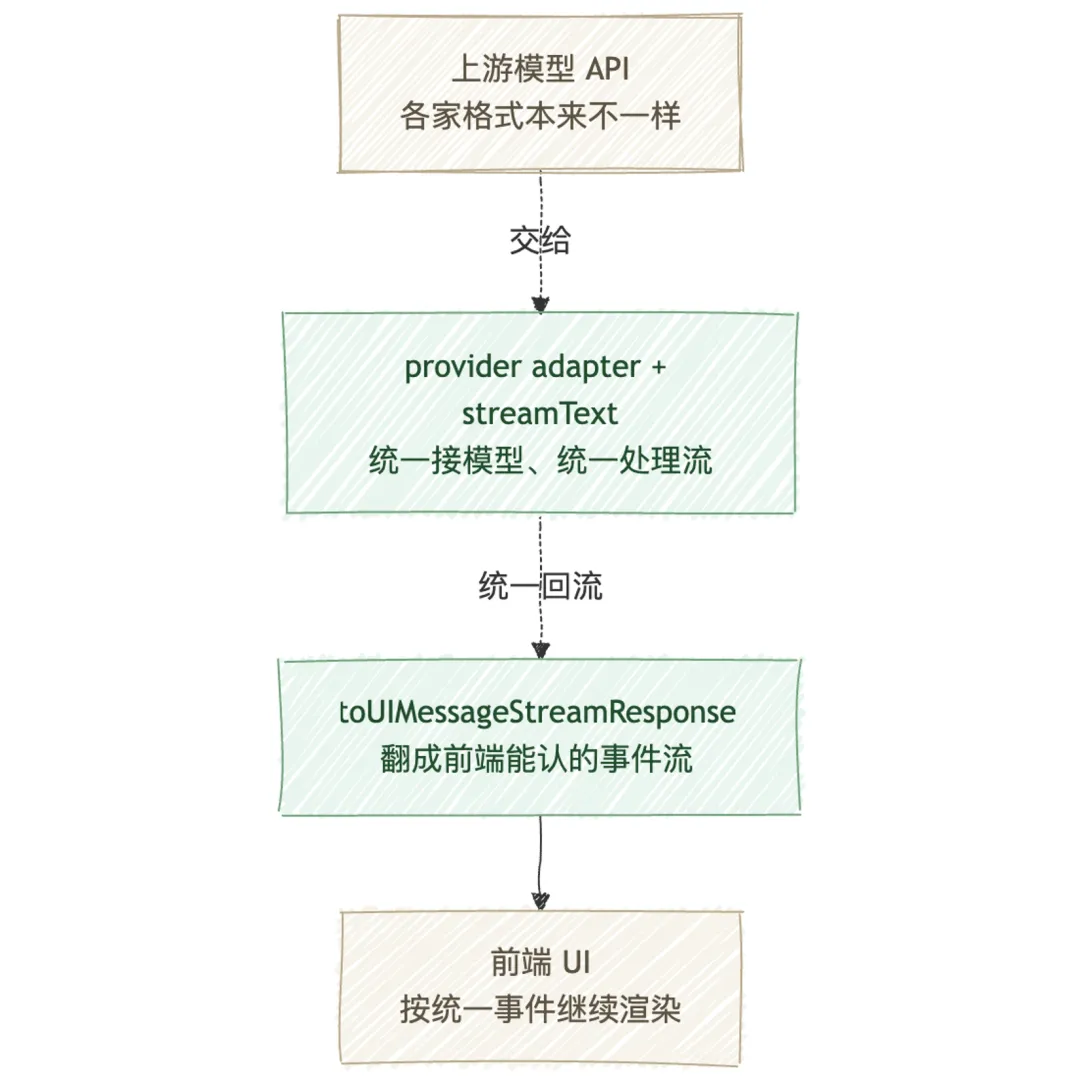 先别动前端,用 @ai-sdk/openai-compatible 或对应的 adapter 包把厂商 API 包一层,让后面 streamText 能直接调,上游差异先在这里隔离掉。