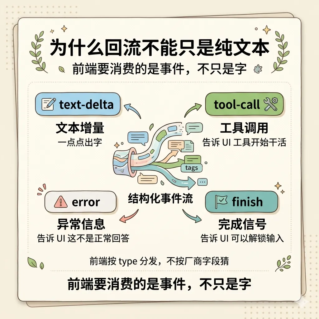 如果流里只有字,浏览器根本没法区分哪段是思考、哪段是工具调用、哪段是错误、哪段是最终回答。