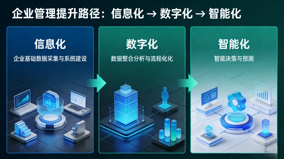 今天,邓老师根据在企业信息化和数字化领域探索了近30年的经验来和大家理一下企业信息化-->数字化-->智能化的路径和逻辑:企业要想真正用好AI,必须先筑牢信息化与数字化的基础,而且每一阶段的跃迁都会对上一阶段的管理质量提出更高的要求。
