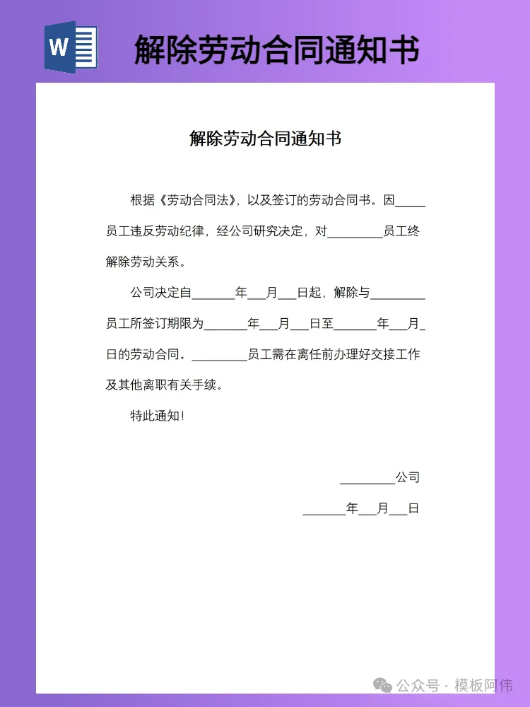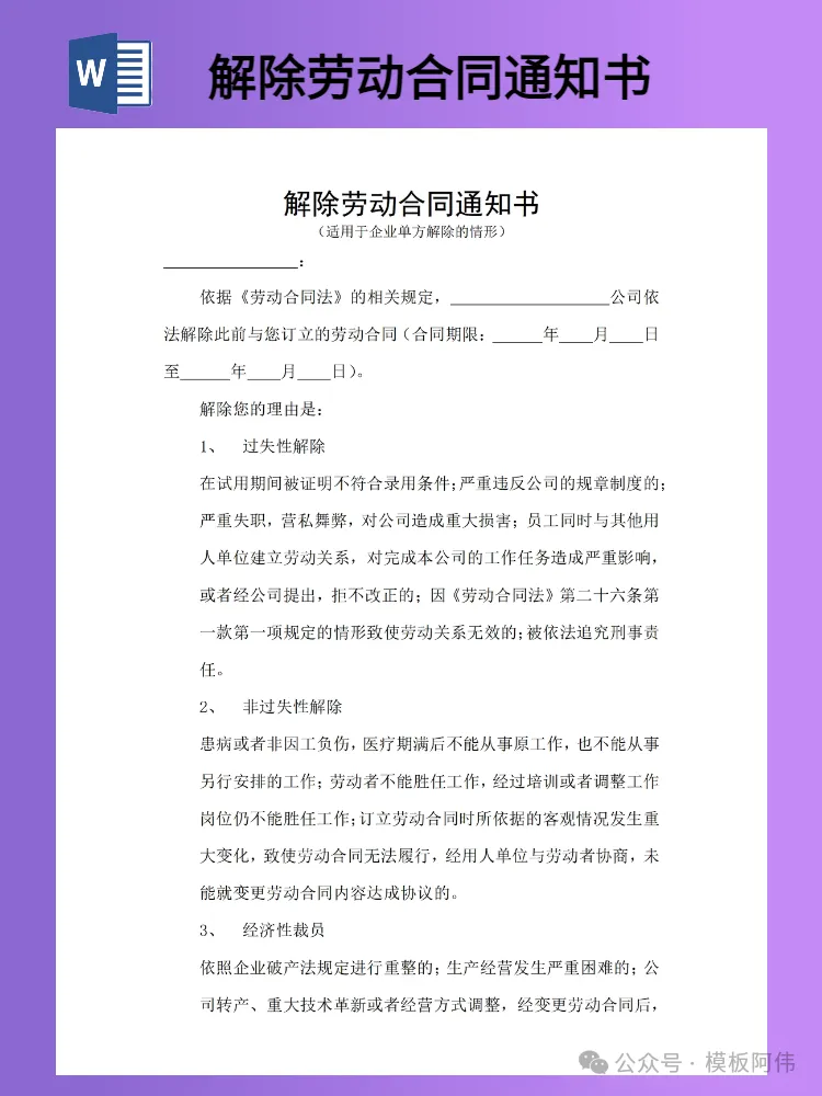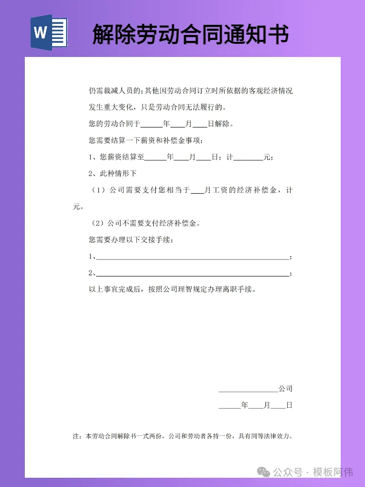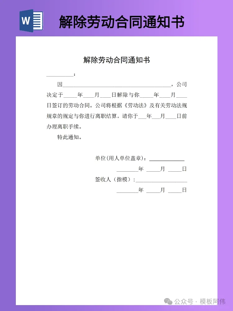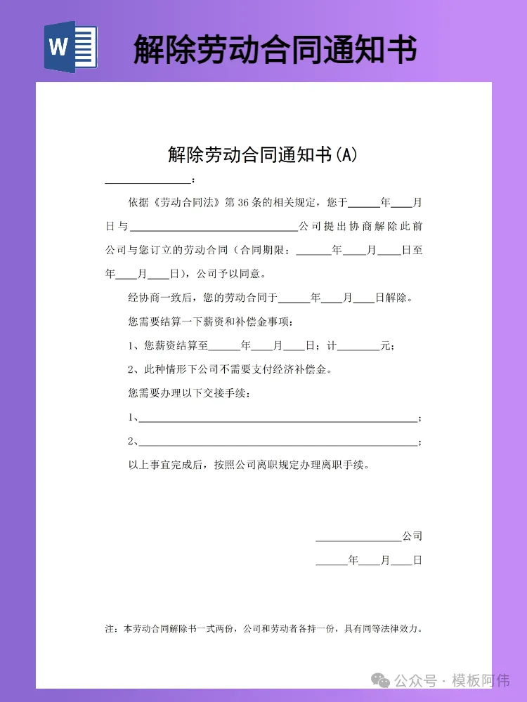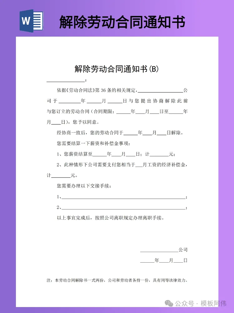 关注后发送消息“解除劳动合同通知书”
