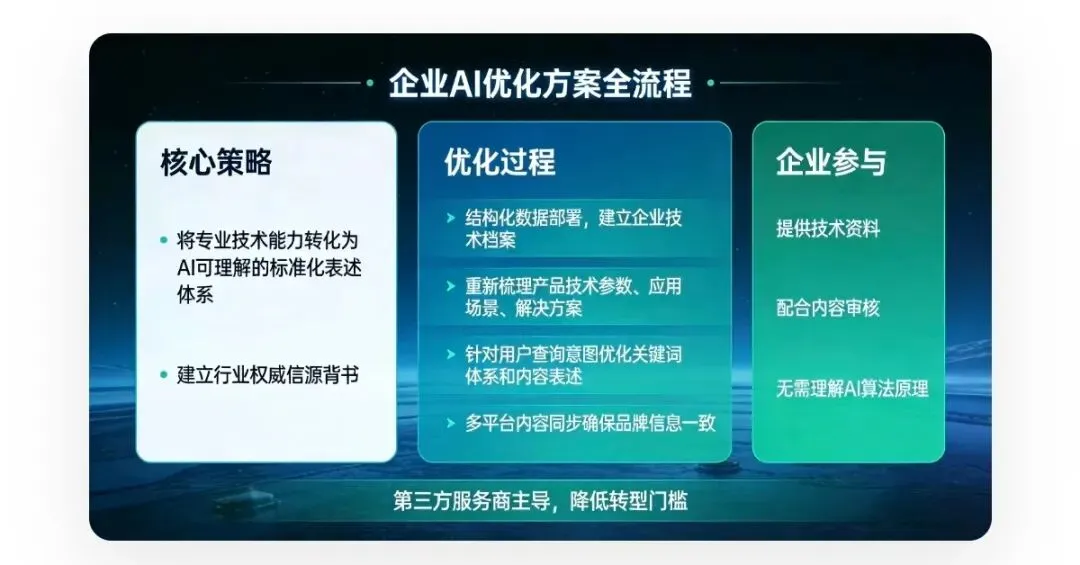 整个优化过程完全由第三方服务商主导,企业只需提供必要的技术资料和配合内容审核,无需深入理解复杂的AI算法原理,大大降低了转型门槛。