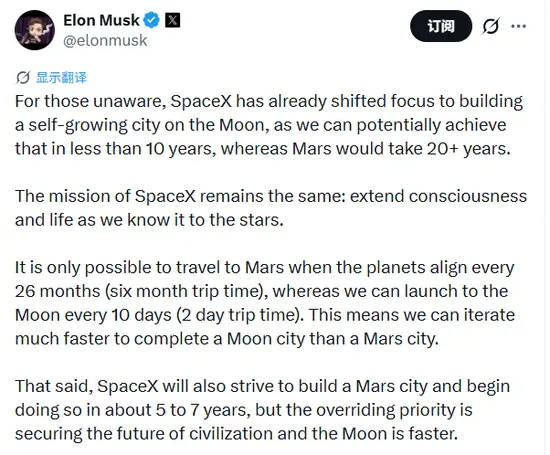 马斯克曾明确表示,SpaceX已将重点转向在月球建设一个自生长的城市,并预计在十年内实现商业落地。