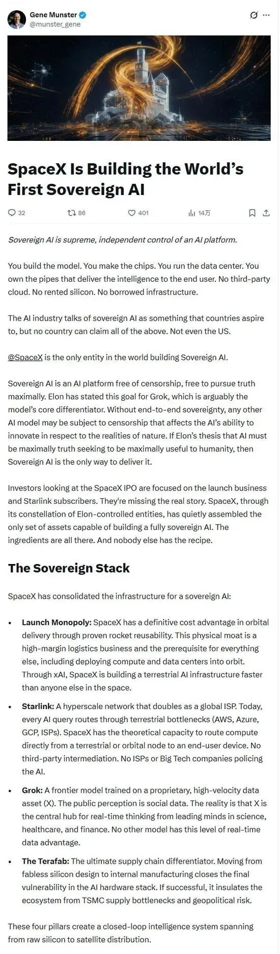 尽管争议不断,但资深科技分析师吉恩·芒斯特(Gene Munster)等看多派认为,外界严重低估了SpaceX走向公开市场的真正商业价值。在他看来,SpaceX正在组装全球唯一一套能够构建完全主权AI的庞大资产堆栈。