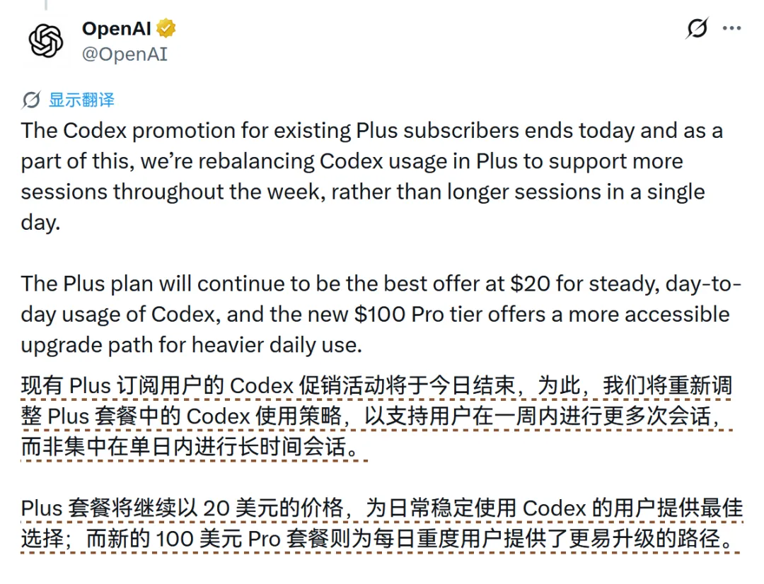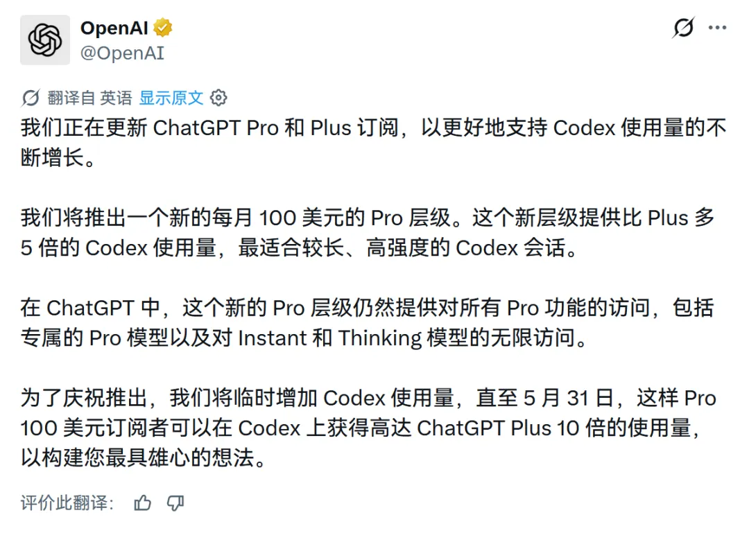 这次 100 美元 Pro 的重点,不只是额度提升到 Plus 的 5 倍,也不只是促销期内最高能到 10 倍。更关键的是,OpenAI 已经不再把所有用户都放在同一个台子上服务了。高强度开发者、重度工作流用户、偶尔用一用的普通用户,正在被明确分层。