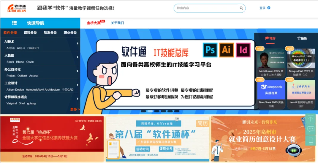 中新金桥软件通是一款专注计算机软件技能实战培养的平台,它覆盖办公、设计、编程、AI、三维动画等全品类软件学习视频教程,是课堂学习、职场提升、技能进阶的超实用助手!