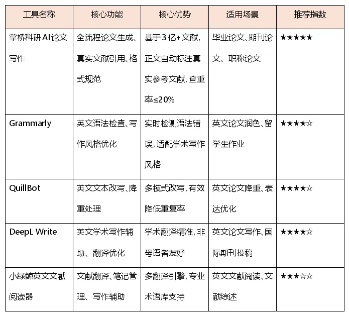 选择AI论文写作工具时,需结合自身需求:如果你是本科生需要写毕业论文,掌桥科研AI的全流程支持更为合适;如果你主要需要英文论文润色,Grammarly是更好选择;如果面临英文文献阅读障碍,小绿鲸能提供有效帮助。重要的是明确工具定位——它们是辅助而非替代,合理使用才能事半功倍。