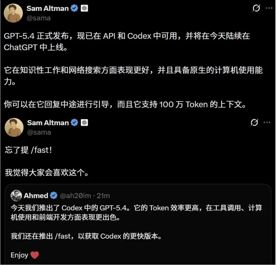 开发者端:GPT-5.4接入API与Codex,并附带极速版GPT-5.4 fast