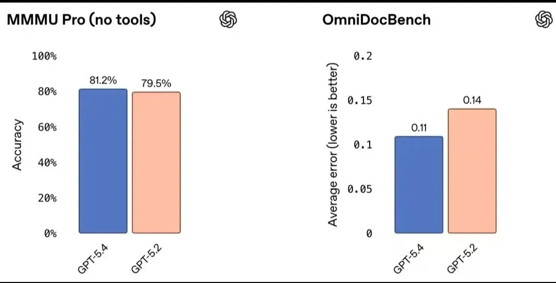 在OmniDocBench上,GPT-5.4(未开启推理强度)的平均误差为0.109,而GPT-5.2为0.140。