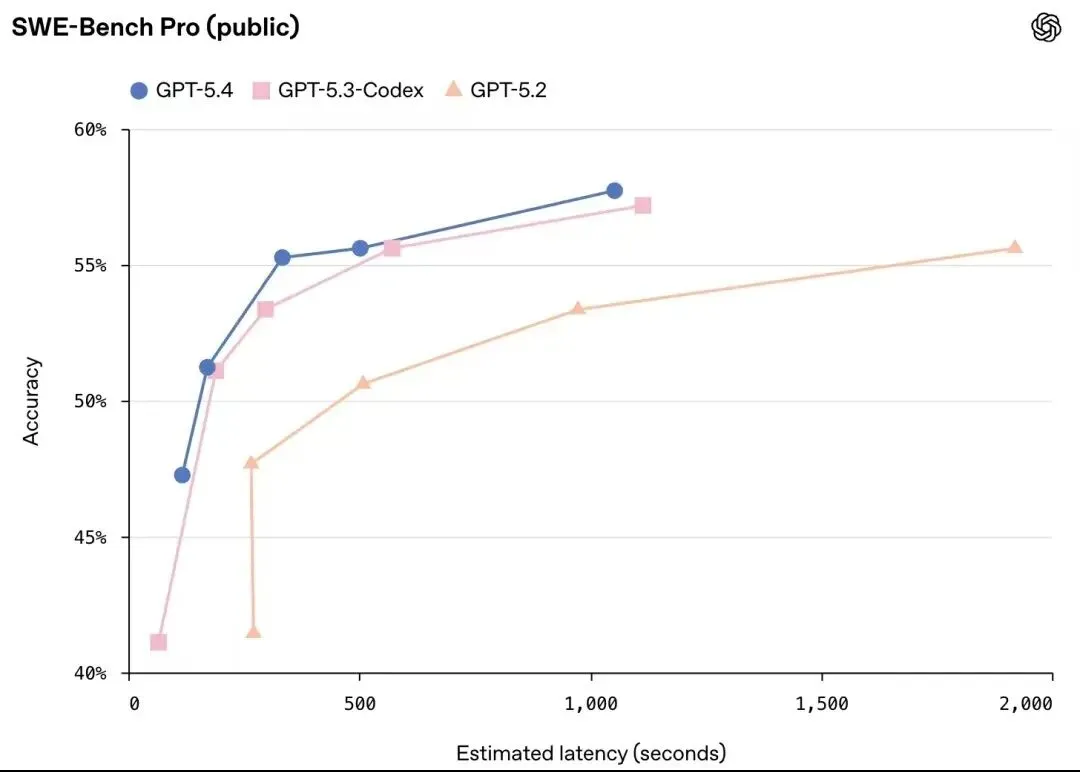 而且在各种推理强度设置下,GPT-5.4的延迟都低于GPT-5.3-Codex。