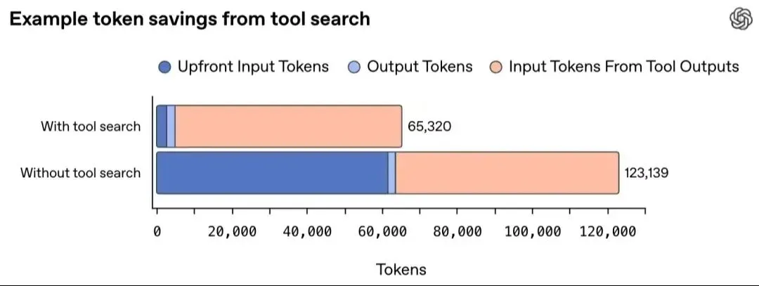 在Scale的MCP Atlas基准测试(250个任务,开启全部36个MCP服务器)中,工具搜索配置在保持相同准确率的同时,将总Token使用量减少了47%。