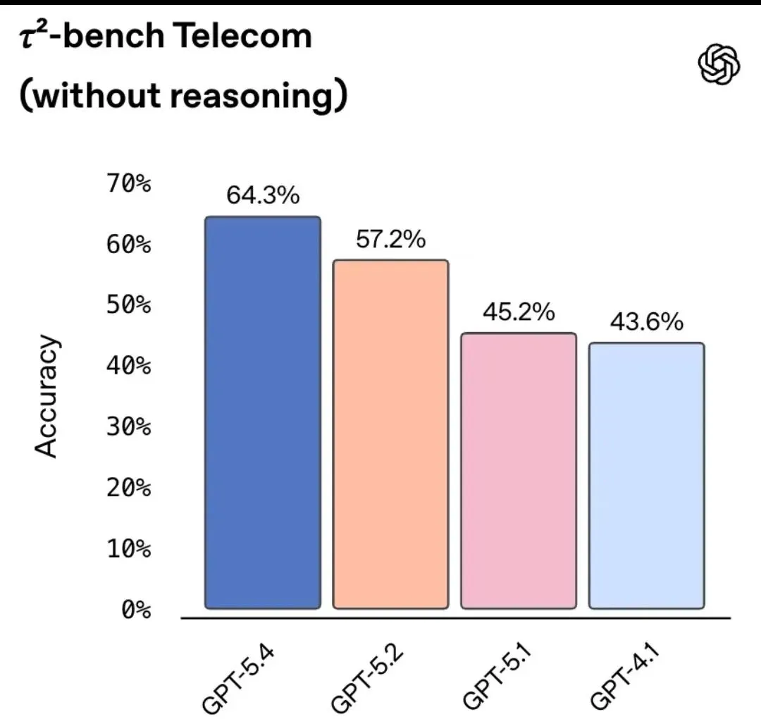 对于延迟敏感的场景(推理强度设为None),GPT-5.4在τ²-bench电信客服任务上也大幅领先。