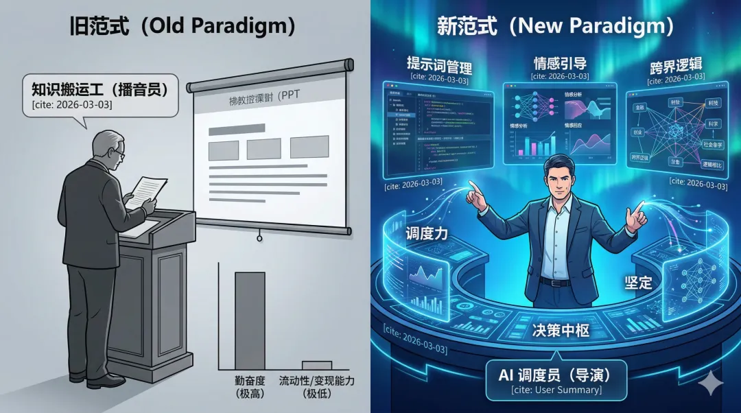 1. 教师将从“知识搬运工”转型为“提示词工程师”。 未来的考核重点,绝不是考你怎么操作软件,而是考你如何调度 AI。一个牛掰的老师,不再是因为他能背出多少公式,而是因为他能引导学生向 AI 提出最深刻的问题。 2. “课堂导演”将取代“知识播音员”。 以后写教案、批改作业这种体力活,注定交给 AI。老师的精力将释放出来,去处理更复杂的情感引导和逻辑构建。 3. 职业维度的“降维打击”会更加普遍。 这和我们在金融、科技行业拼杀的同龄人面临的处境一模一样。在这个时代,如果你还想靠“勤奋的搬运”生存,那你注定会被 AI 取代。真正的核心竞争力,在于你对工具的“调度力”。