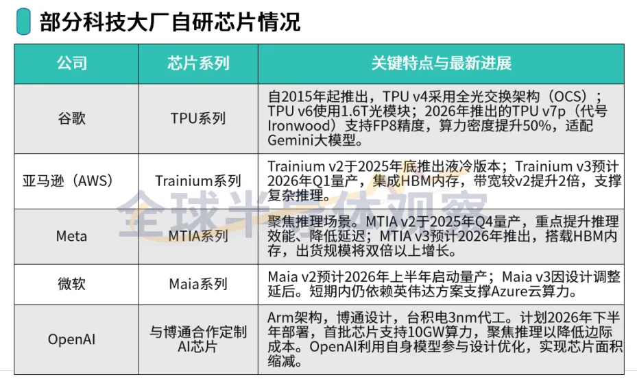 从技术路线看,各家公司各有侧重: 谷歌深耕TPU系列十余年,最新TPU v7p已适配Gemini大模型的多模态训练;亚马逊Trainium系列聚焦AI训练,即将量产的v3版本将集成HBM内存,带宽翻倍;Meta的MTIA系列则主攻推理场景,v2已量产,v3预计2026年推出;微软Maia系列虽有延期,但仍在持续推进;OpenAI则与博通、台积电联手,计划2026年下半年部署首款3纳米制程的推理芯片,单芯片支撑10吉瓦算力。