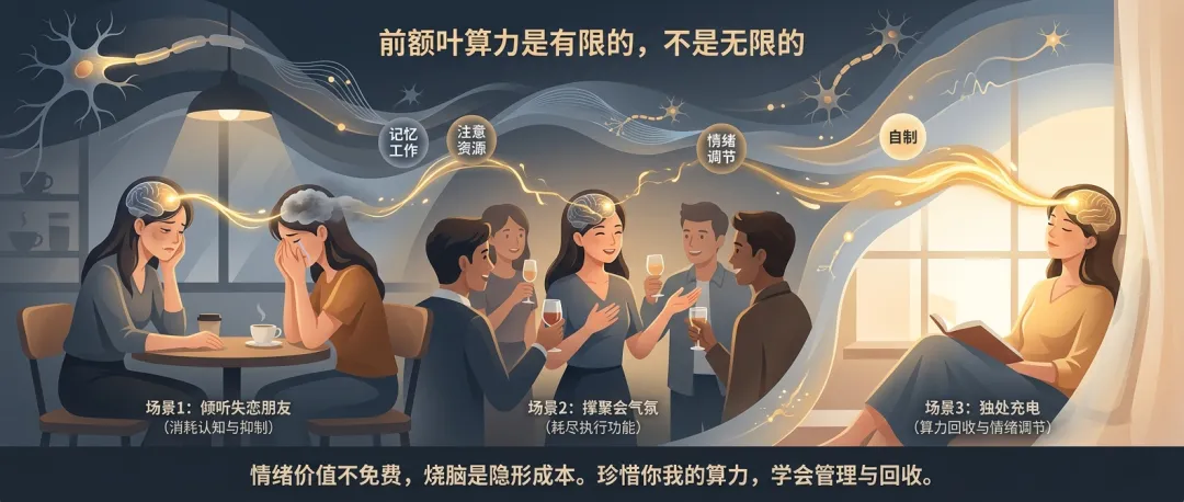 "这些都需要大量的前额叶算力,"林老师说,"所以聚会结束后,你会觉得'被掏空',需要独处来'充电'。"