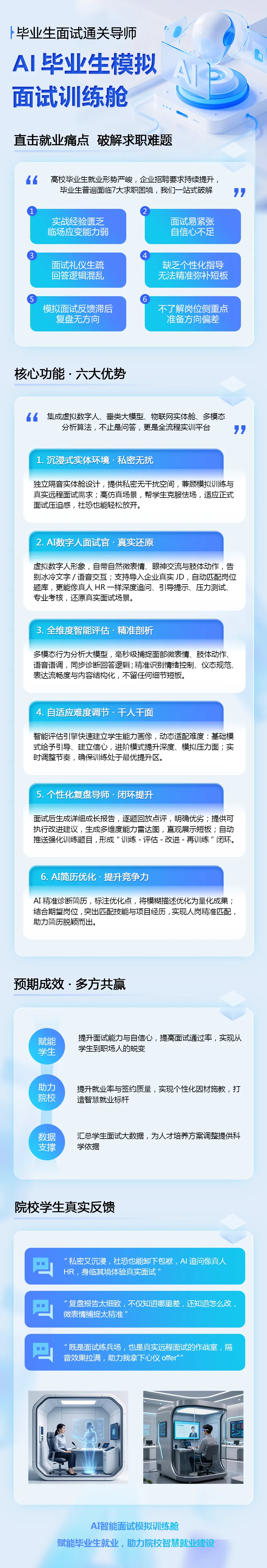 沉浸式体验: 通过高仿真环境,帮助学生克服“怯场”心理,适应正式面试的压迫感。