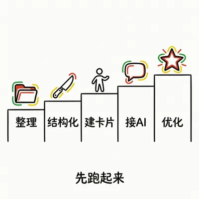 第一步:把散落各处的文档整理到统一地方(飞书/腾讯文档/Obsidian) 第二步:把非结构化内容结构化(PDF2Skills / OBsidian) 第三步:让团队每个人都建自己的知识卡片(OBsidian) 第四步:打通知识库和AI对话入口( 知识库/ 龙虾) 第五步:用反馈数据持续优化知识质量(用户点赞/纠错机制)