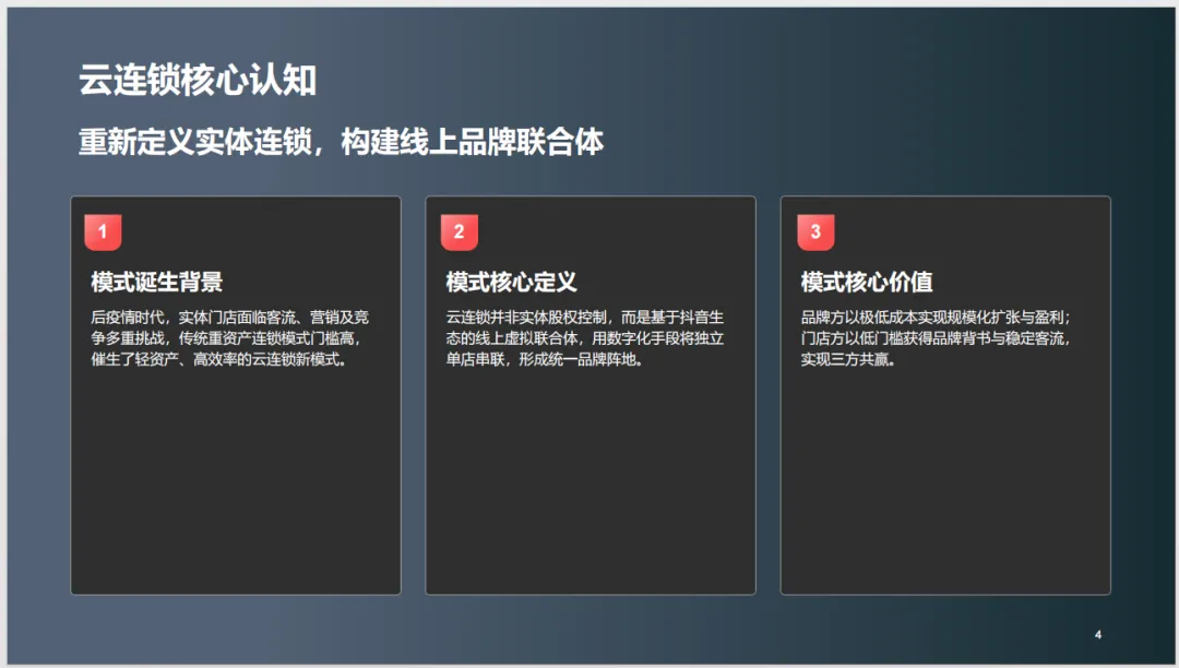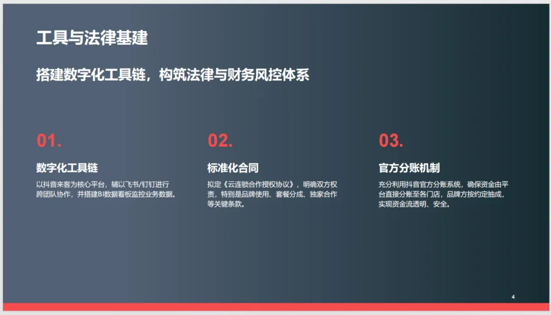 这份《2026年抖音本地生活云连锁起盘手册》实体商业的数字化转型提供了一条清晰、可复制的轻资产路径。面对后疫情时代的普遍挑战,传统重资产扩张模式门槛过高。手册系统解构的“云连锁”模式,通过线上虚拟联合体连接分散的实体门店,实现了品牌方以极低成本快速规模化,以及门店方低门槛获得品牌与流量支持。这为大量面临增长瓶颈的中小品牌和实体商户,提供了一种切实可行的突围方案,降低了数字化升级的门槛。手册构建了一套从认知到执行的完整商业操作系统,将模式创新转化为可量化的行动。它超越了零散的战术分享,以“道、法、术、器”为框架,系统性地涵盖了商业模式认知、团队构建、法律风控、阶段性执行SOP、具体运营战术以及长期风险应对与组织升级。这种结构化、阶梯式的设计,使得无论是初创团队还是寻求转型的企业,都能按图索骥,减少试错成本,提升从0到1乃至从1到100的成功率。倡导的“三方共赢”模式,平衡了品牌、门店与平台(抖音)的利益,通过统一运营、分账机制等设计,构建了更稳固、可持续的合作关系。其终极展望“产业路由器”——集成供应链、数据智能与金融服务——更是将云连锁定位为产业价值中枢,推动实体商业从简单的流量交易,迈向基于数据与深度赋能的产业协同,提升了整个生态的效率和韧性。这份手册的是一套赋能工具,帮助参与者在不确定性中构建增长的确定性,加速了本地生活领域数字化、网络化、平台化进程的实践落地,对广大实体经营者具有现实的指导价值和启发意义。
