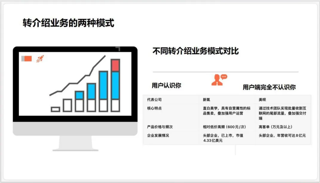 核心模式解析:明确区分两种转介绍模式。一是“用户端完全不认识你”的模式(如美呗),通过技术批量获取流量,主打高客单项目交付。二是“用户认识你”的IP模式,通过社交媒体建立专业信任,再进行转化。