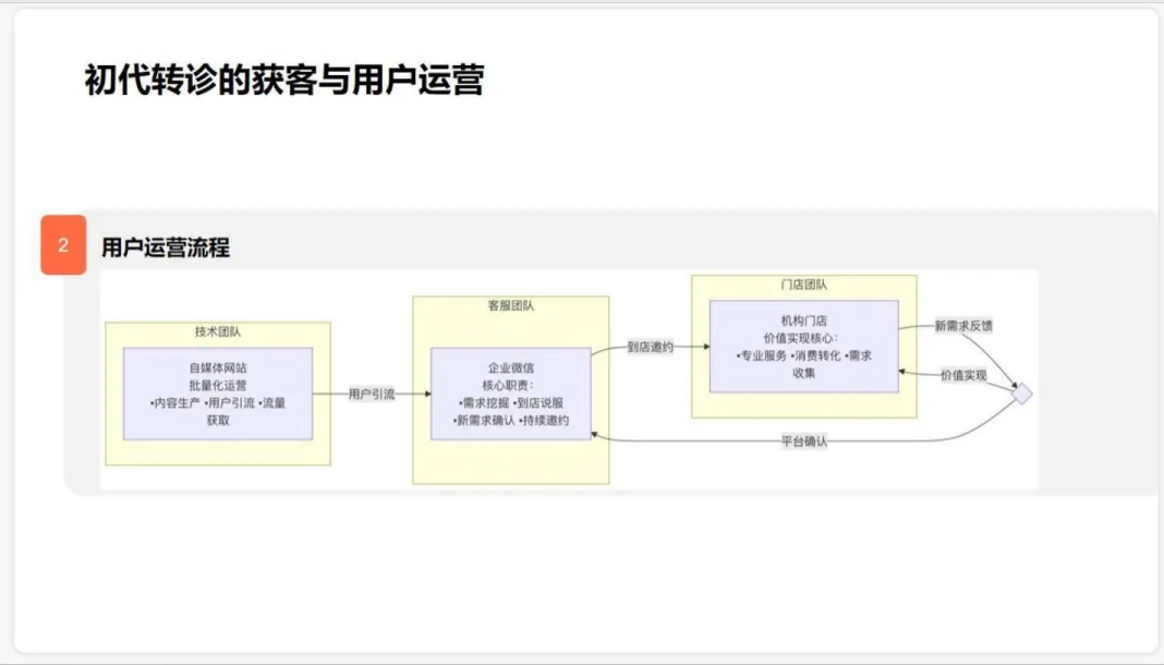 用户运营流程:构建了“内容引流-企业微信承接-机构转化”的闭环。企业微信承担需求挖掘与到店说服的关键角色,门店负责服务转化与需求反馈,平台进行协调与确认。