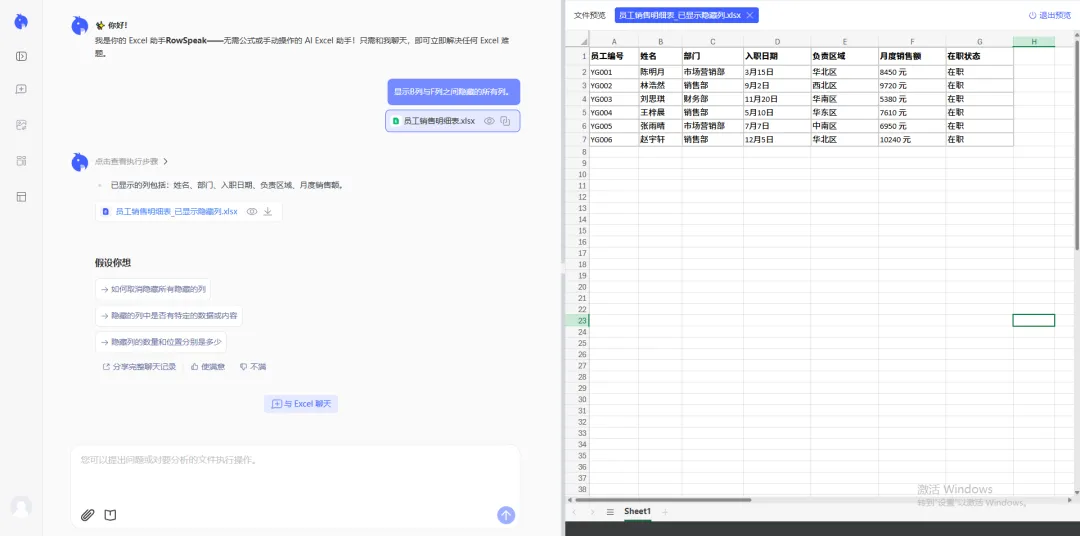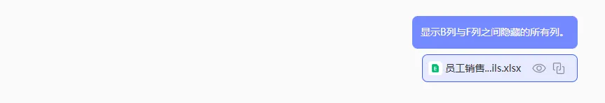 2.直接输入指令,例如: “取消这张表中所有隐藏的列” ”显示 B 列到 F 列之间隐藏的列“