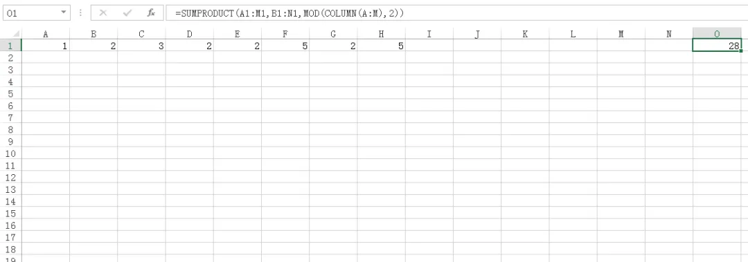 Excel小技巧,同一行数据中,两个数相乘后再相加公式例如:A1*B1+C1*D1+E1*F1+......=总和公式:=SUMPRODUCT(A1:M1,B1:N1,MOD(COLUMN(A:M),2))