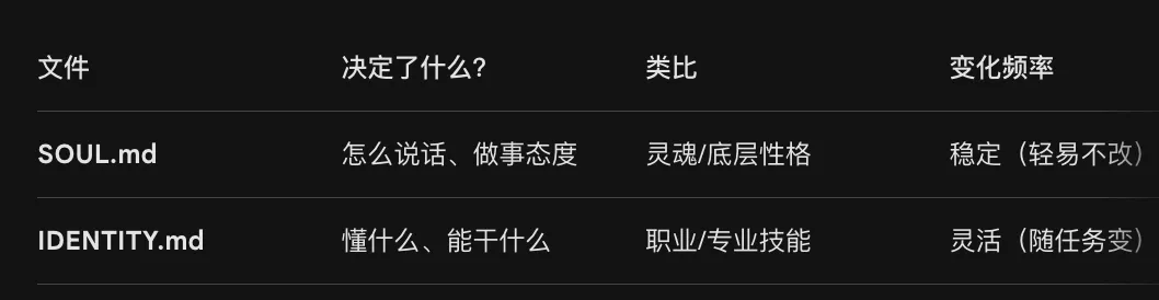 SOUL.md 决定了:你是一个正直、勤快、幽默的人。 IDENTITY.md 决定了:你现在是一名“资深中医”、“Python 程序员”还是“你的私人健身教练”。