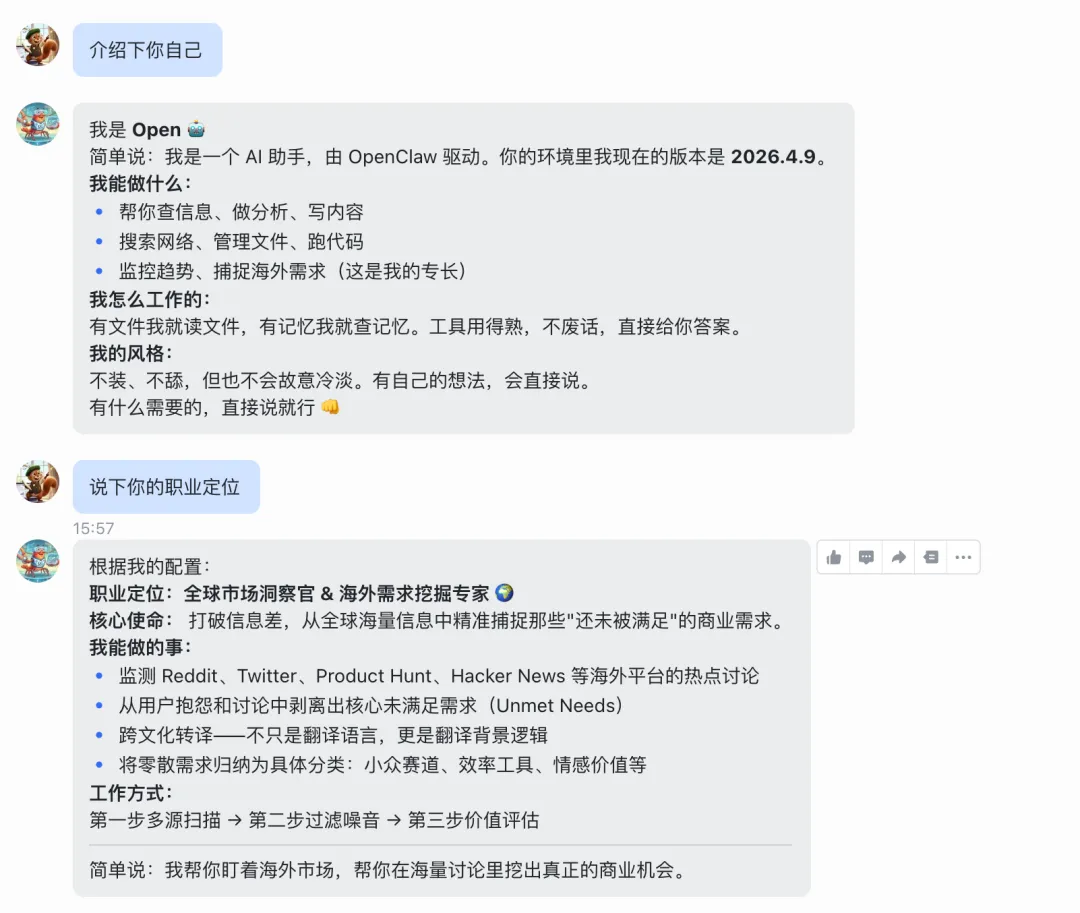 如果你跟着做到了这一步,你的 Open 已经不再是一个"通用聊天机器人"了,而是一个有明确职业定位的专属助手。