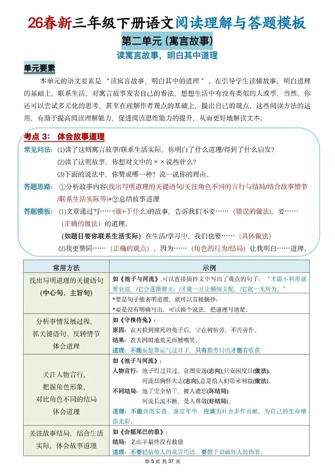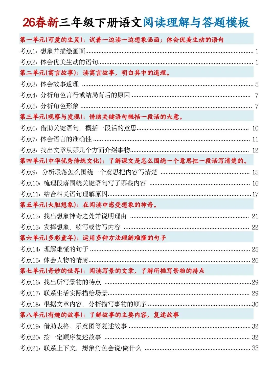 🔔2026春|三年级下册语文【1-8单元基础知识默写清单】,共37 页,是阅读理解专项提分资料。资料按课本 8 个单元划分,紧扣单元语文要素,梳理21 个阅读理解高频考点,配套标准答题模板、解题思路、答题示范、修辞手法总结、类文练习,覆盖想象画面、赏析句子、明白道理、概括段意、理解难句、复述故事等必考题型。内容直击考点、模板通用、讲解清晰,聚焦阅读理解答题规范、采分点、解题技巧三大核心,适合日常阅读训练、单元复习、期中期末考前冲刺,是三年级下册语文阅读理解答题规范化、快速提分的实用模板资料。有电子版,可下载打印,完整PDF可在本文底部参照下载方式获取。