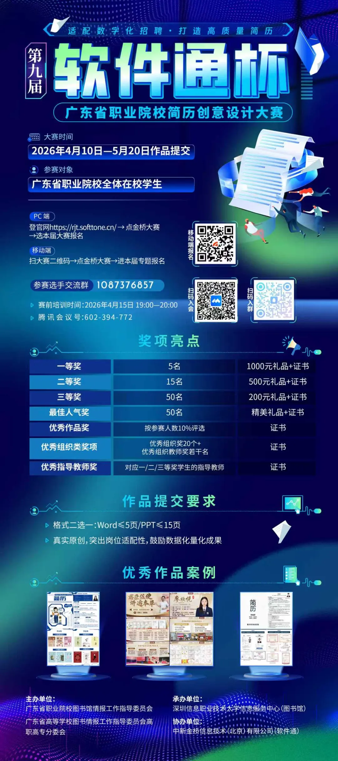 为贯彻教育部2026届高校毕业生就业创业工作会议精神,响应“就业扩容提质行动”号召,传承前八届“以就业为导向、以能力为核心、以创新为动力”的办赛宗旨,由广东省职业院校图书馆情报工作指导委员会、广东省高等学校图书情报工作指导委员会高职高专分委会、深圳信息职业技术大学图书馆联合中新金桥信息技术(北京)有限公司,共同举办“软件通杯”第九届广东省职业院校简历创意设计大赛。